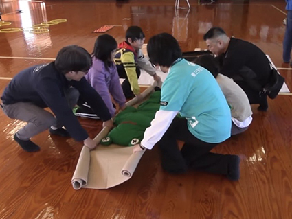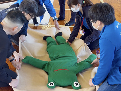 防災体験ではスポーツとコラボした防災スポーツ(ジャッキアップゲーム・毛布で担架タイムトライアル)を、こども未来館ここにこと東三河防災クラブの協力により実施されました。