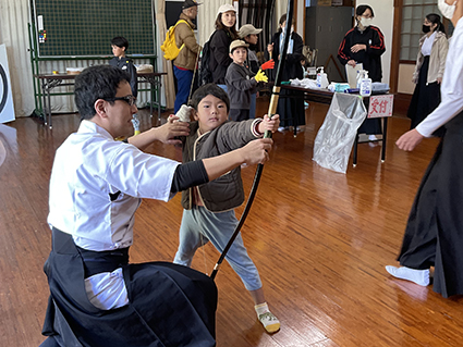 弓道場とアーチェリー場では、初めて弓を引く参加者が多く、凛々しい姿に拍手が起こるなど、和やかな空気が広がりました。